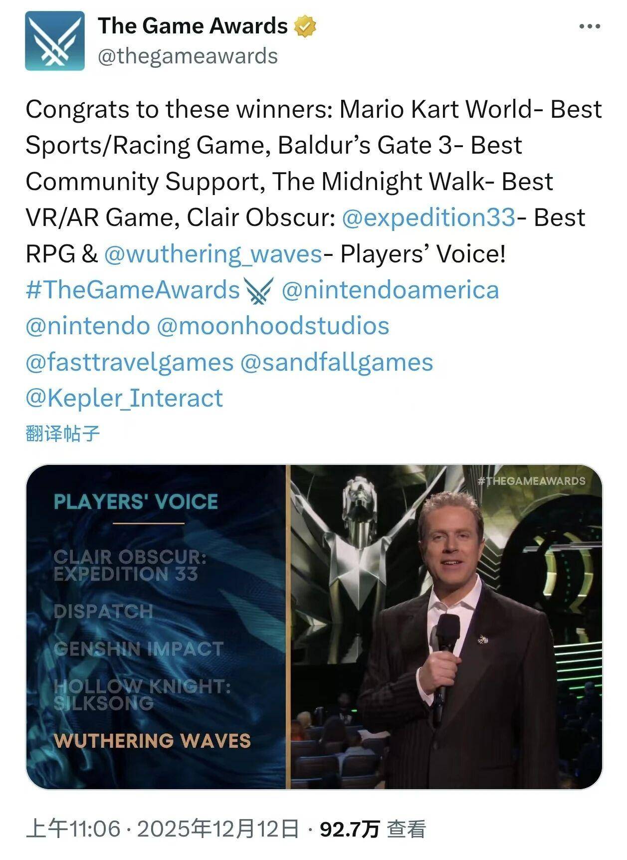 有游戏业内人士向南都记者介绍,TGA被视为游戏界的世界级奖项,而“玩家之声”奖项主要由全球玩家自主投票决定,直接反映游戏在玩家群体中的真实热度。