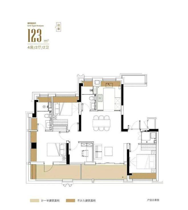 约123㎡的四房户型则是区域内同面积段罕见的4开间朝南设计,南北通透的格局搭配三阳台配置,附赠面积高达约17.6㎡,将观景、晾晒、休闲需求全满足,刷新了舒适度的上限;