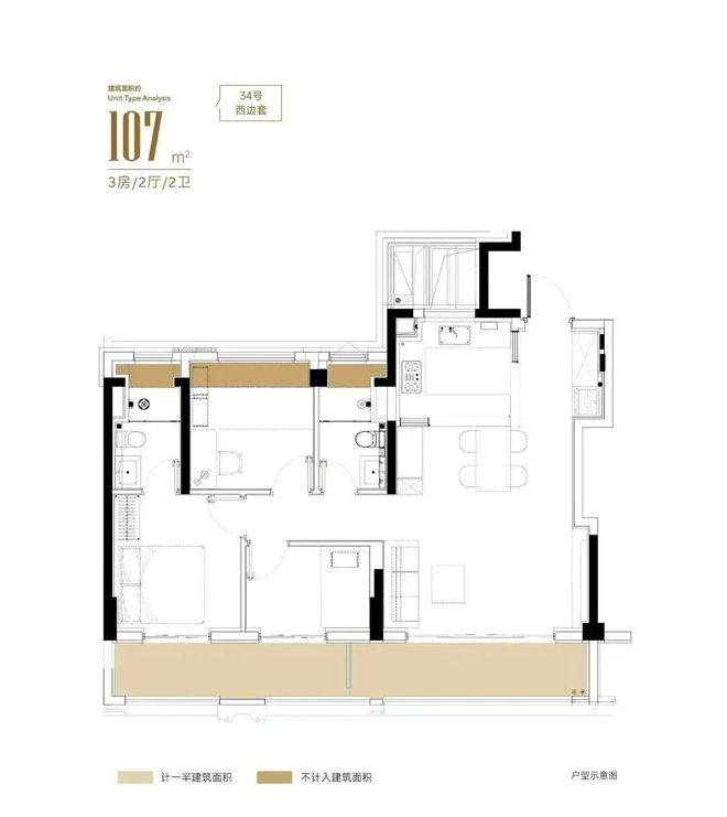 约107㎡户型还打造了约5米超大宽厅,搭配3.5开间南向面宽与南北通透格局,让采光通风效果俱佳;