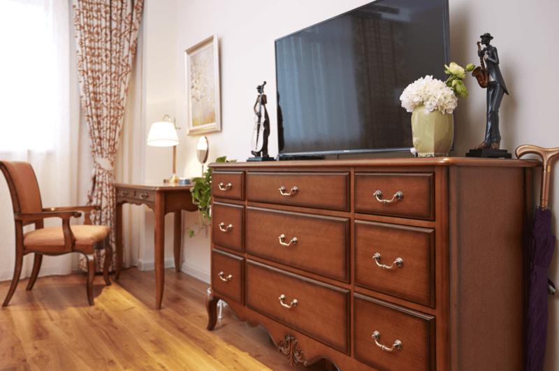 社区为每位(对)长辈提供独立生活空间,每个房间配备单独门锁,保障私密性,同时配置独立洗衣机、冰箱等家电,满足日常起居需求。空间设计全面贯彻适老化、无障碍理念,安装新风系统可有效去除PM2.5,保障室内空气质量;家具采用圆角设计,地面做防滑处理,卫生间配备扶手与助浴设施,全方位降低意外风险。软装布局融入“家”的温暖,纯实木家具、天然石材与地板环保健康,床品、软装选用高支棉材质,亲肤舒适;视觉专家定制温暖橙色与淡雅绿色配色,搭配柔和明亮的照明设计,避免强光刺激,营造温馨氛围。老物件摆设与留声机流淌的音乐,唤醒长辈青春记忆,让居住更有温度。