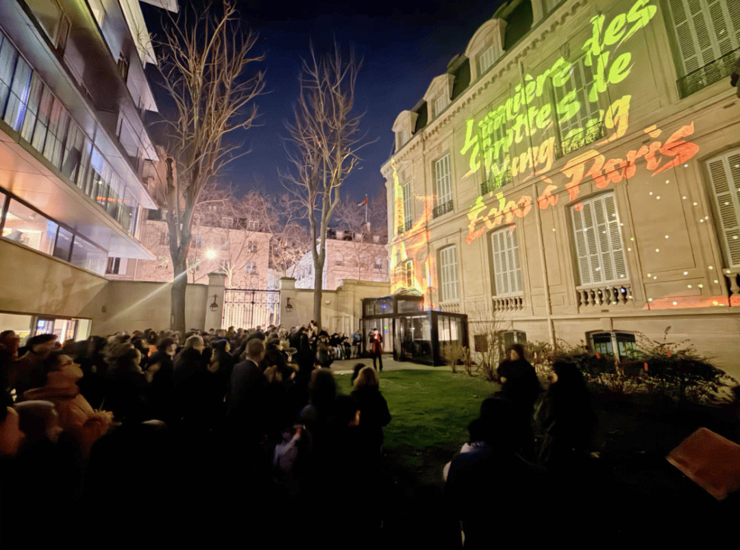 在庭院,观众则欣赏了“云冈石窟之光·巴黎回响”光雕秀。光影在夜色中铺陈,音乐与画面相互牵引,将千年石窟艺术转译为可感、可见的当代表达:庄严的造像、流动的纹样与空间层次在投影中重现,仿佛把历史的回声带到巴黎当下。至此,这一晚的节庆从热闹走向震撼——观众在同一座院落里完成一次跨越时空的文化相遇,也把“在巴黎过中国年”的记忆定格在光影最亮的瞬间。