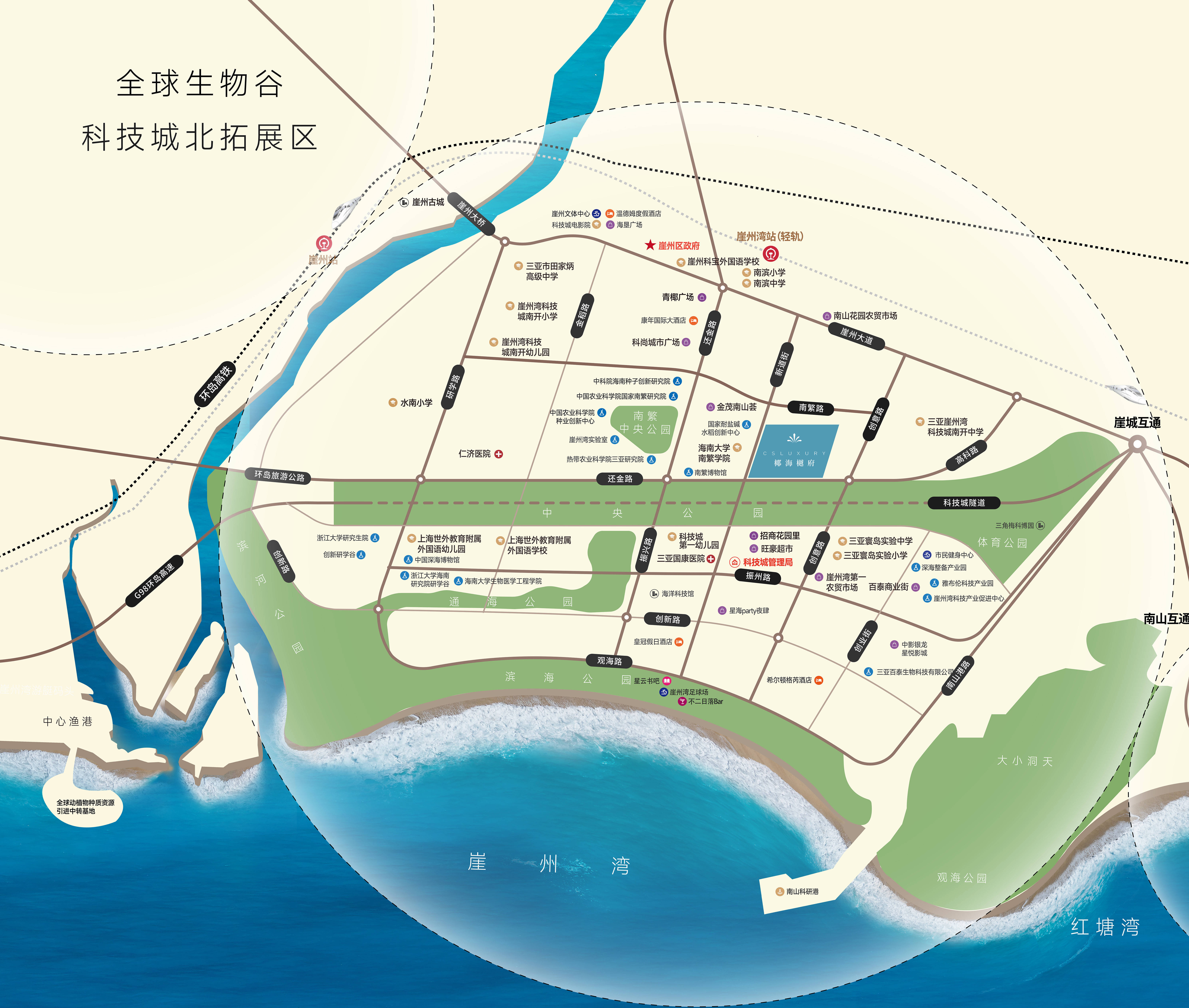 地处三亚西翼发展核心的崖州湾科技城,是海南自贸港13个重点园区之一,总体规划面积约69.3平方公里,重点发展南繁科技、深海科技及科教研发三大主导产业,是三亚培育产业转型新业态、打造海南自贸港建设科创高地的重要增长极。