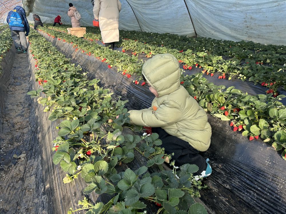 2026年1月22日,在河南洛阳孟津区送庄镇十里香现代农业观光园,前来研学的孩子们体验采摘草莓的乐趣。(受访者供图)