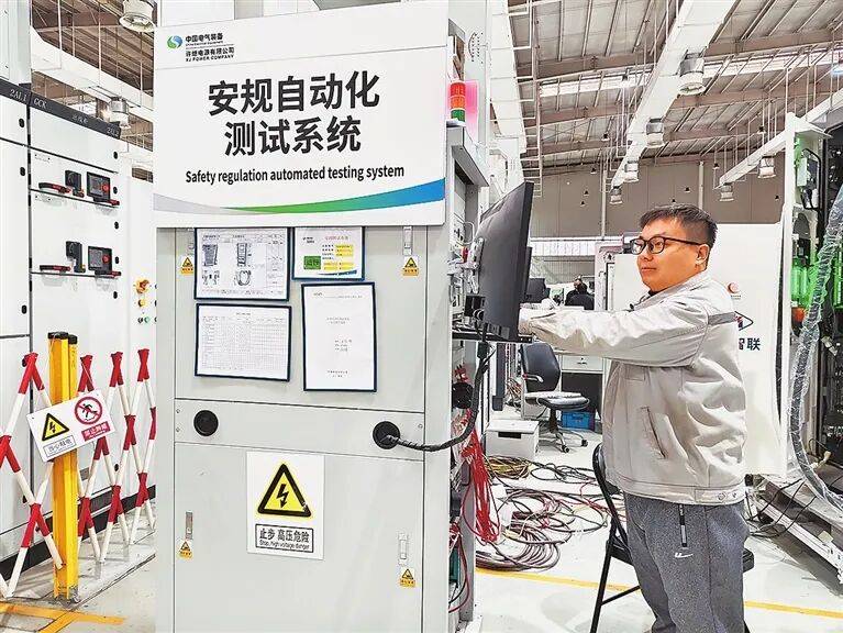 在中国电气装备许继电源有限公司的生产车间内,技术人员正对新能源充电设备进行测试。马涛 摄